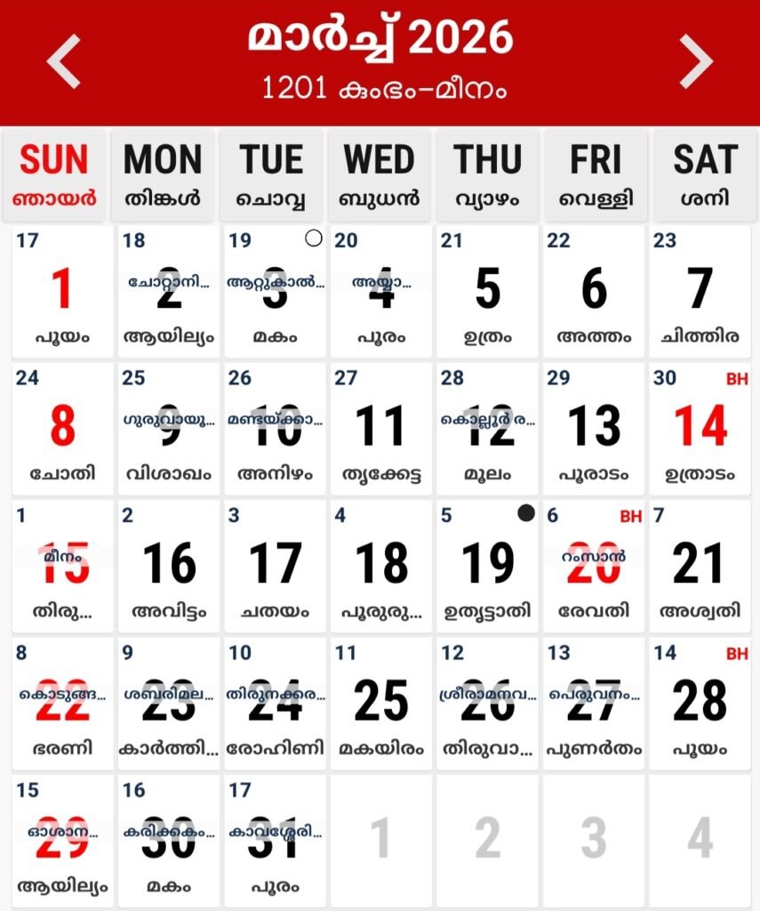 | 3 | 04/03/2026 | Wednesday | ഹോളി, അയ്യാ വൈകുണ്ഠ സ്വാമി ജയന്തി |