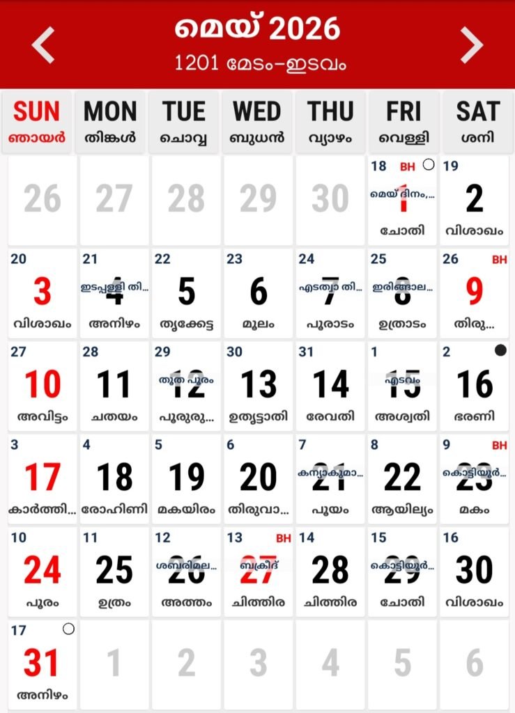 2026 മെയ് മാസത്തെ കലണ്ടറും വിശേഷപ്പെട്ട ദിവസങ്ങളും ഏതൊക്കെയാണ് എന്ന് നോക്കാം